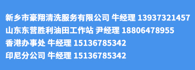 新鄉市豪翔清洗服務有限公司經營30多年,專注從事工業設備清洗和防垢劑、清洗劑的科技性企業。  本公司以防垢和清洗為一體,綜合性為您提供服務:鍋爐防垢能使你免受停產所帶來的苦惱,并且節約能源;清洗使您的設備清新如初,延長使用壽命。公司以誠信面對社會,將您提供良好的服務。業務領域具體包括: ·工業管道·冷凝器·換熱器·冷卻器·中 央空調·冷卻塔·工業鍋爐 ·化學清洗及高壓射流物理清洗·各種化工設備......